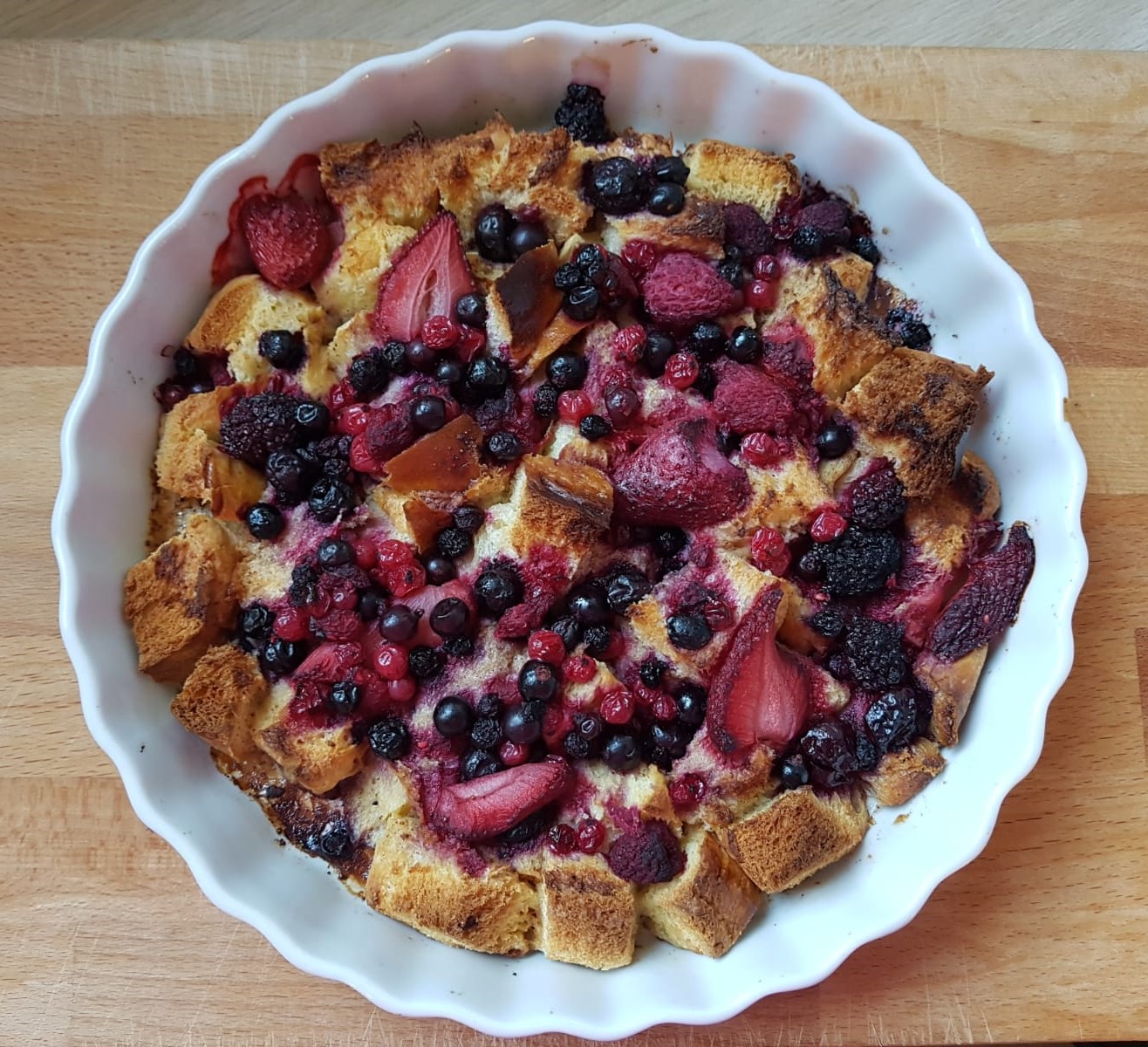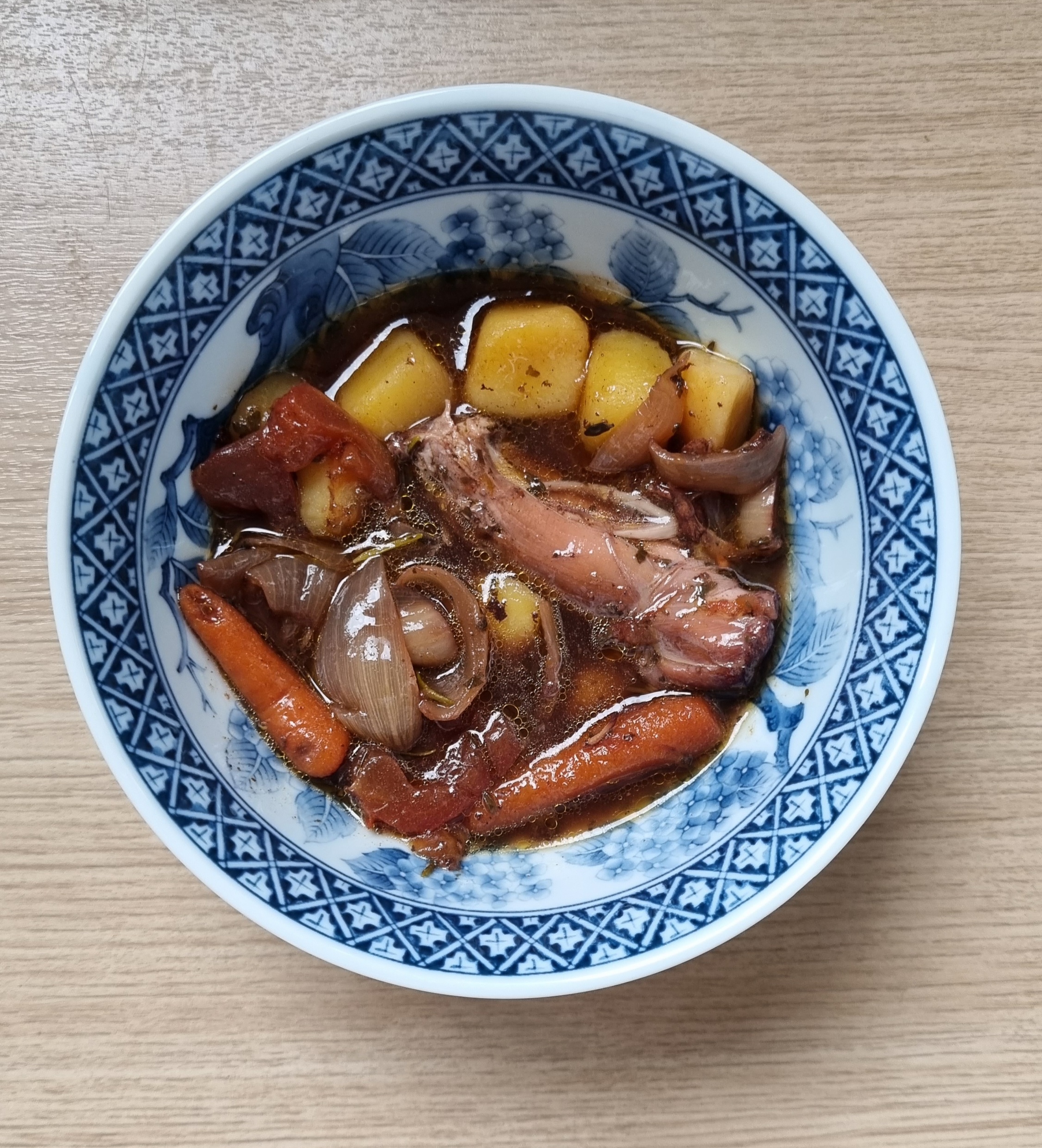 Broodpudding Langzaam gegaarde lamsschenkel met rode wijn en aardappeltjes Papadum tamarinde saus Prei-kerrie soep, met appel en spekjes