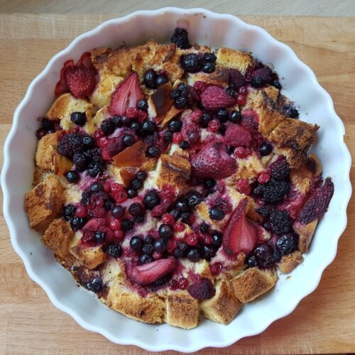- Scheur het briochebrood in stukjes, en leg in de bakvorm